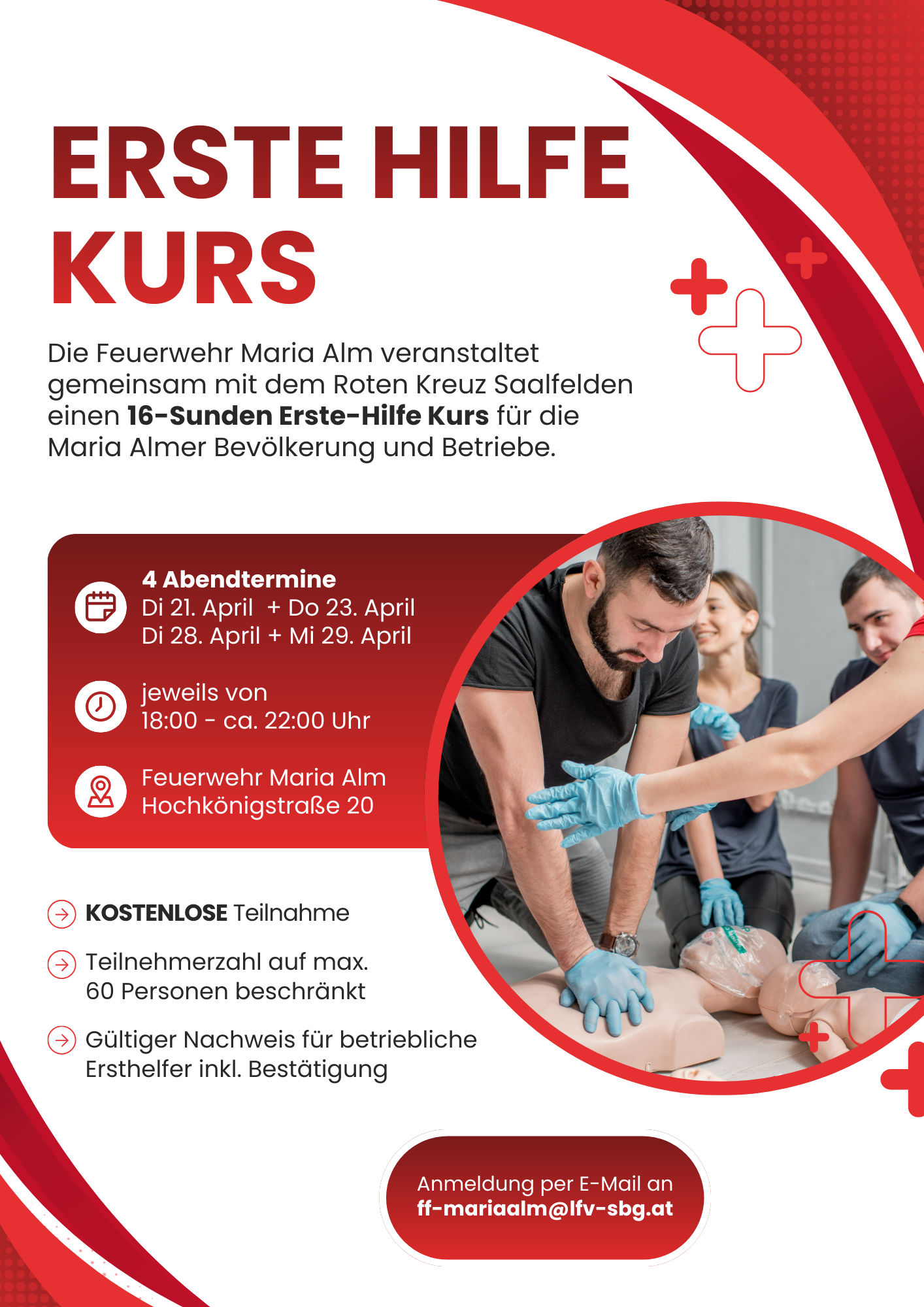 Die Feuerwehr Maria Alm veranstaltet gemeinsam mit dem Roten Kreuz Saalfelden einen 16-Stunden Erste-Hilfe Kurs.