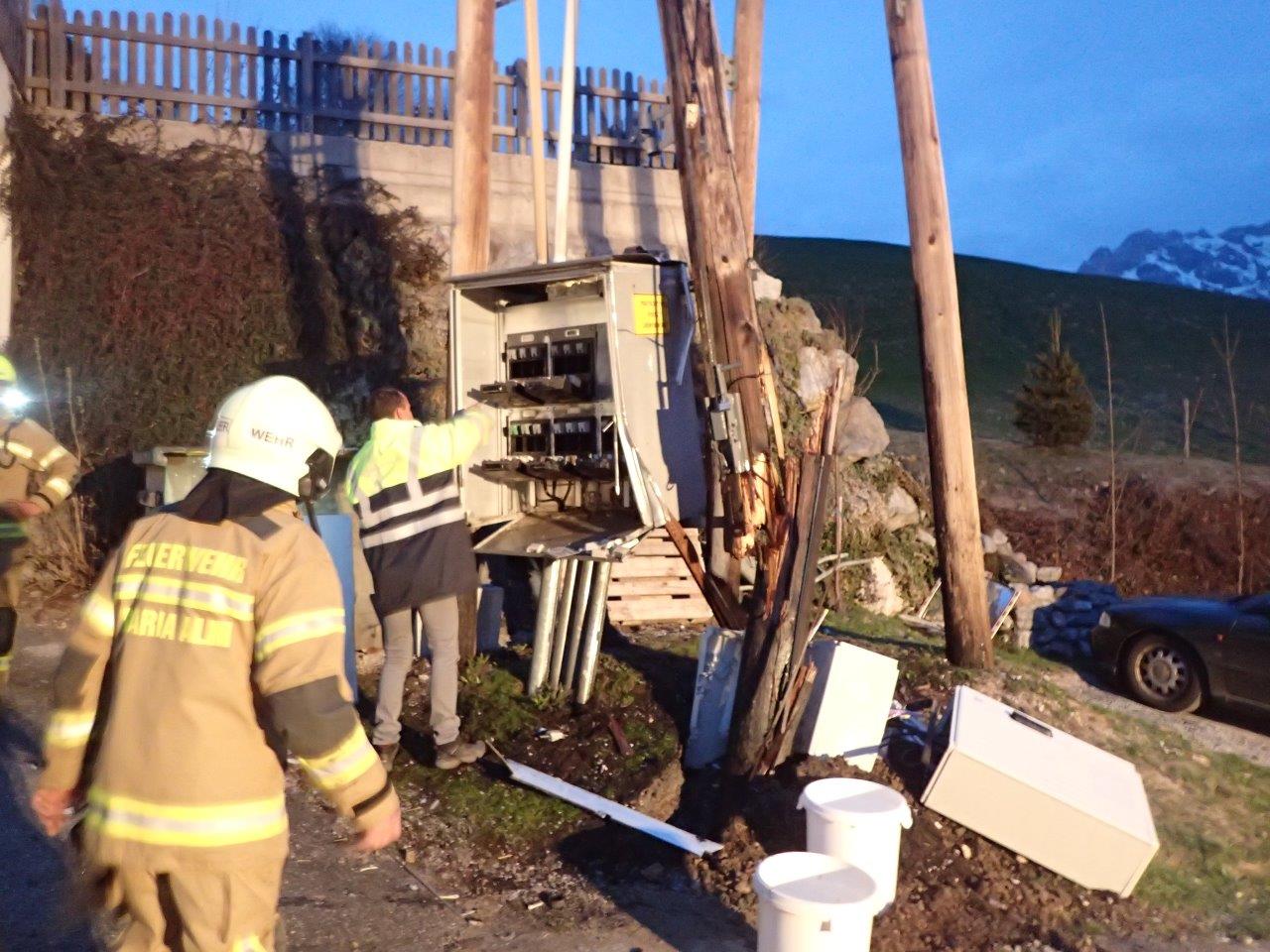 Die Feuerwehr Maria Alm Hauptwache und der Löschzug Hinterthal wurden durch die LAWZ Salzburg zu Aufräumarbeiten nach einem Verkehrsunfall alarmiert. Am Einsatzort stellte sich heraus, dass ein Traktor mit einem Strommasten kollidiert war. Durch den Aufprall wurde der Strommasten stark beschädigt und ein Transformator fiel auf die Gabel des Traktors.