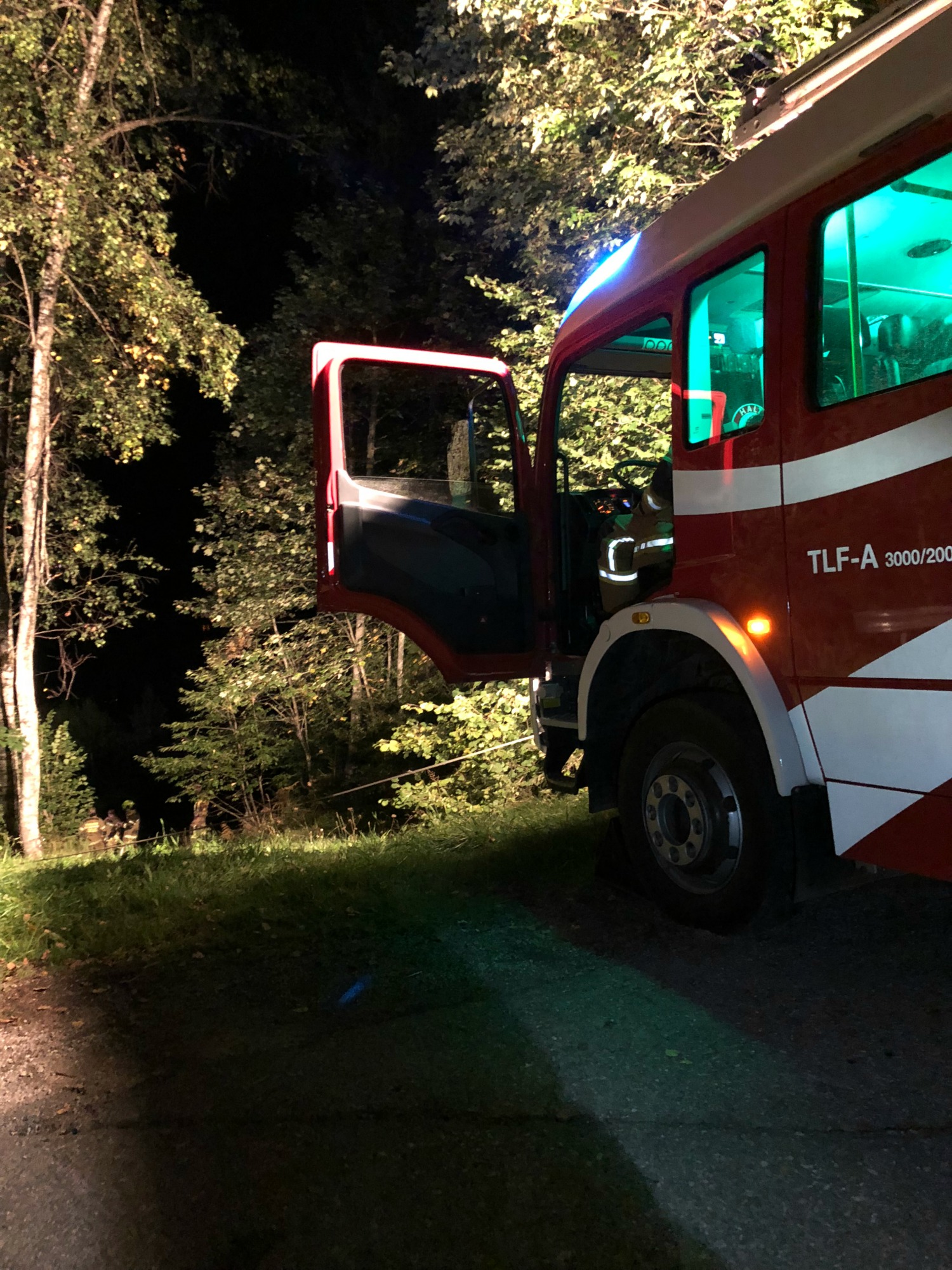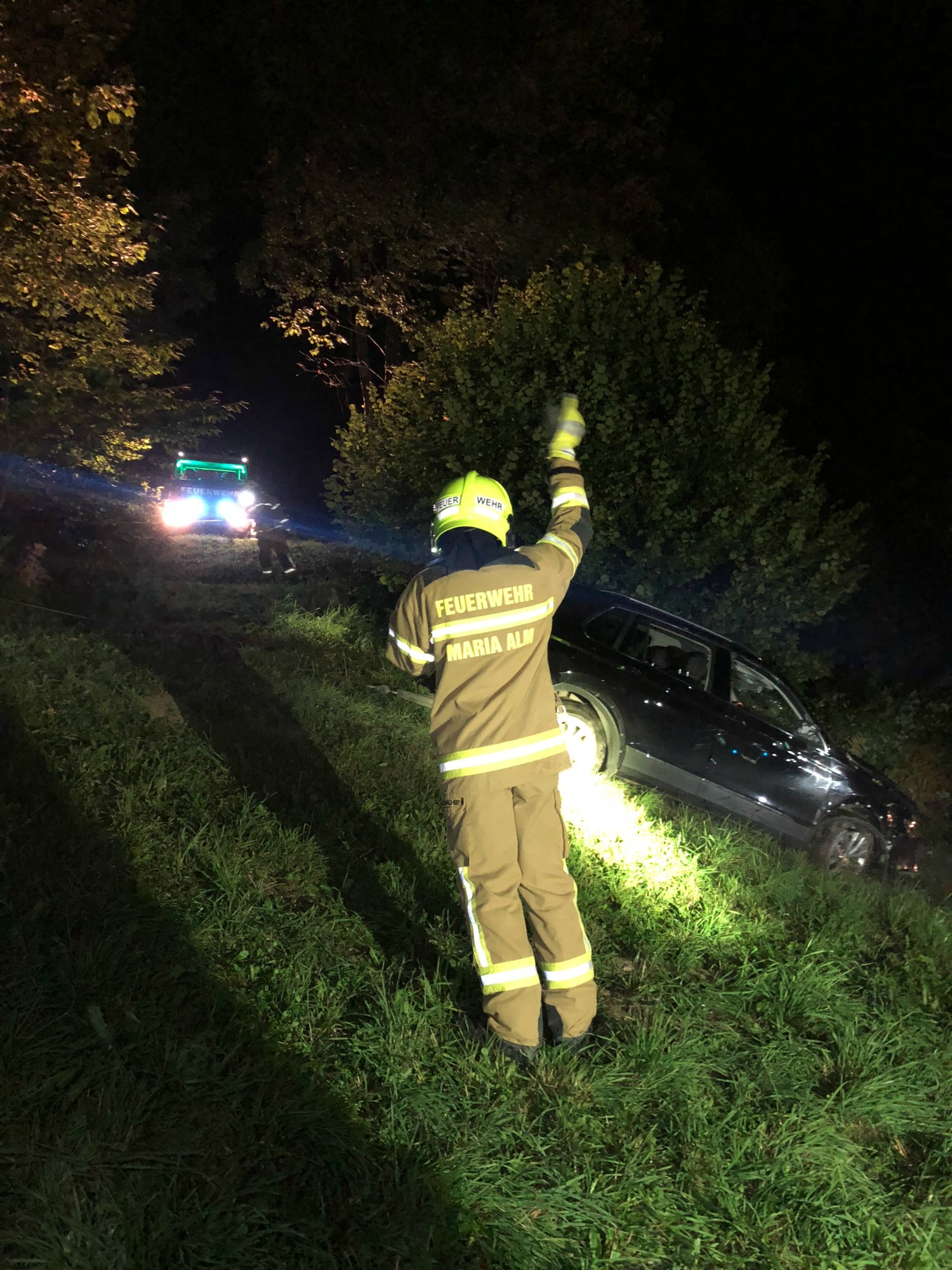 Während einer Übung zum Thema Verkehrsunfall mit eingeklemmter Person wurde die Feuerwehr Maria alm von der LAWZ Salzburg zu einem Einsatz „VU mit eingeklemmter Person“ alarmiert. Laut Alarmierung war ein Fahrzeug bei der Auffahrt zum Gasthof Jufen über eine Böschung gestürzt. Sofort wurde die Übung beendet und zum Einsatzort ausgerückt. Nach Ankunft vom Einsatzleiter wurde festgestellt, dass sich alle Personen aus dem Fahrzeug befreien konnten und vom Roten Kreuz erstversorgt wurden. Das Fahrzeug befand sich in einer gefährlichen Schräglage und drohte weiter abzustürzen. Als Sofortmaßnahme wurde der PKW mit der Seilwinde des TLF gesichert. Weiters unterstützte die Feuerwehr das Rote Kreuz beim Abtransport der Verletzten über eine angrenzende Wiese und zog den PKW mithilfe von Seilwinde, Greifzug und Umlenkrollen zurück auf die Straße.