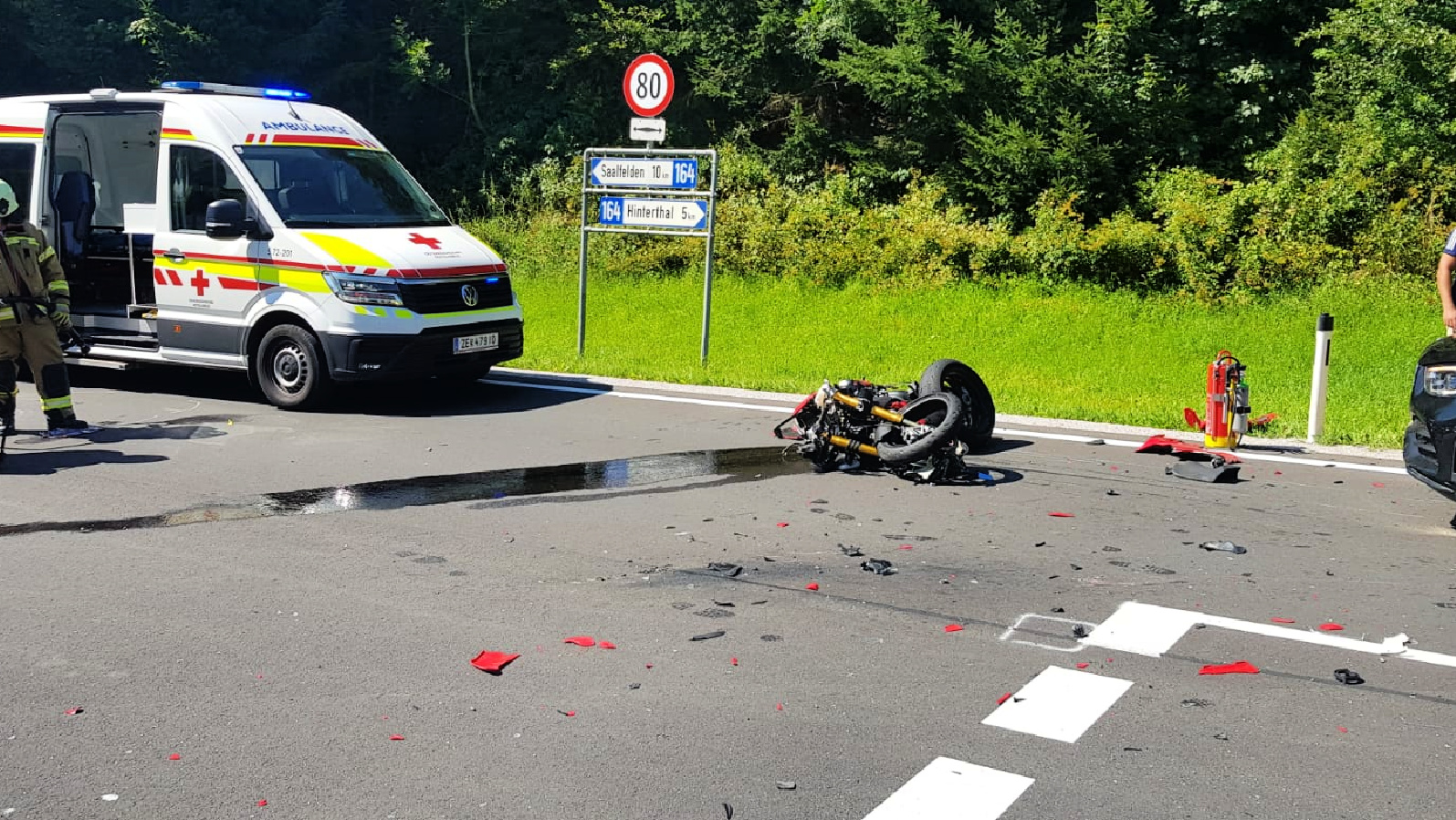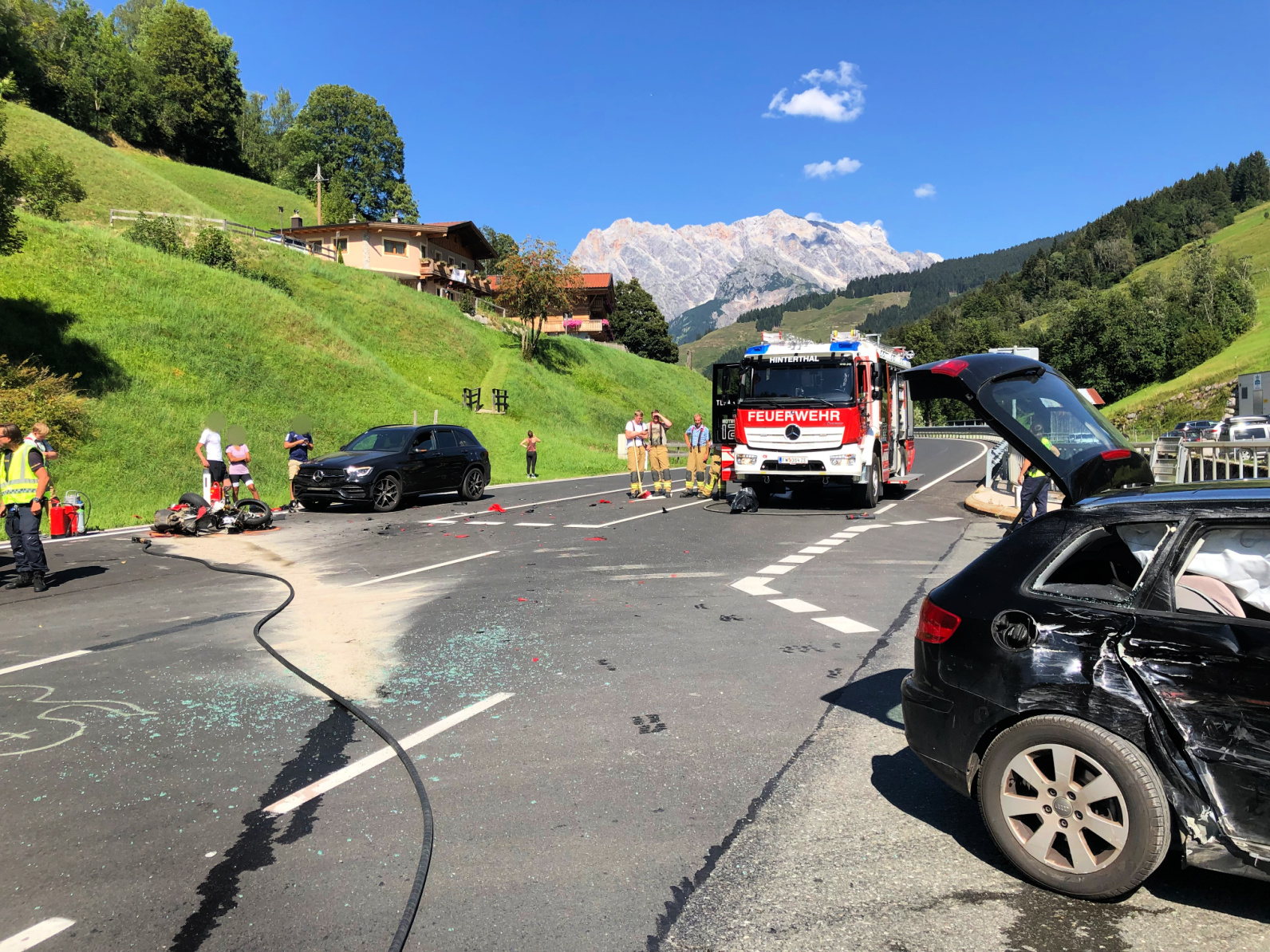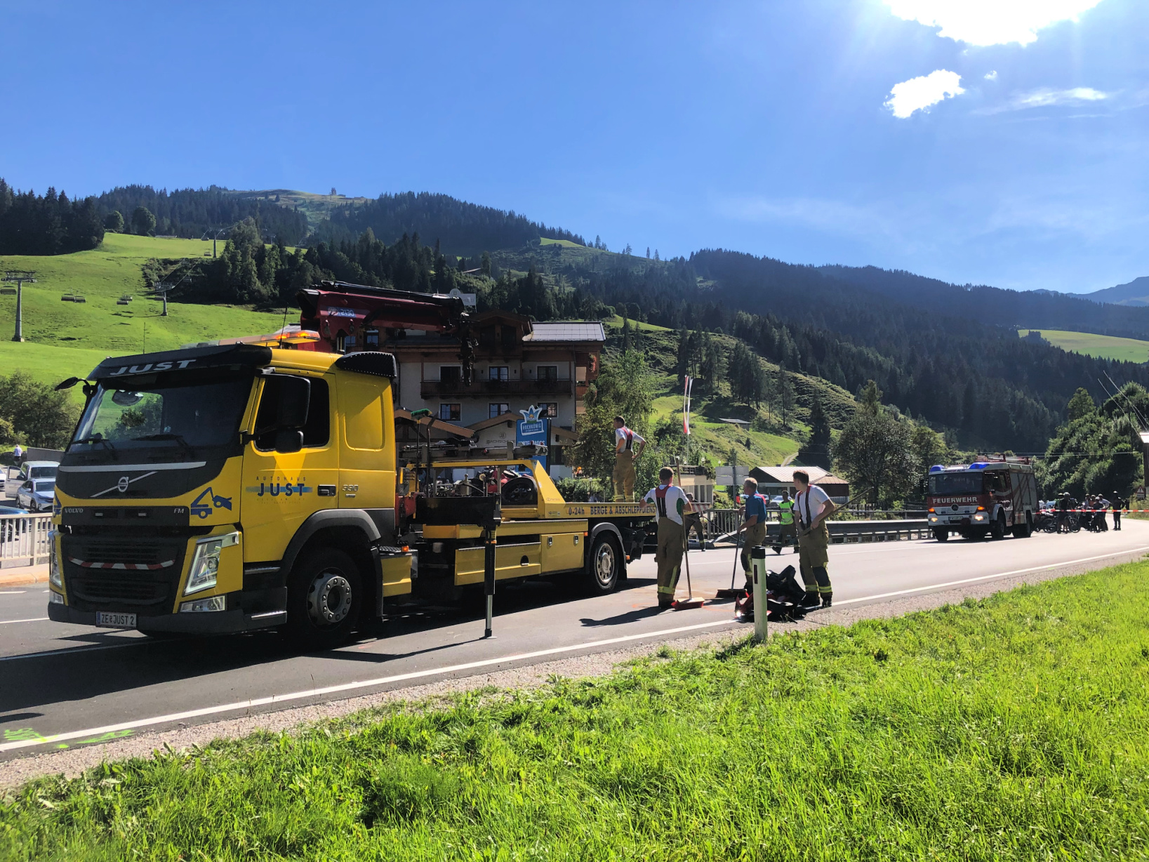 Ein schwerer Verkehrsunfall ereignete sich am Sonntagnachmittag auf der B164, Höhe Einfahrt Hintermoos. Ein Motorradfahrer kollidierte mit einem abbiegenden PKW und wurde dabei schwer verletzt. Der Motorradfahrer und ein Insasse aus dem PKW mussten mit dem Notarzthubschrauber ins Krankenhaus geflogen werden. Nach der Unfallaufnahme durch die Polizei wurde die Straße gereinigt und der Abschleppdienst beim Verladen der Fahrzeuge unterstützt. Nach ca. einer Stunde konnte die Totalsperre der B164 wieder aufgehoben werden.
