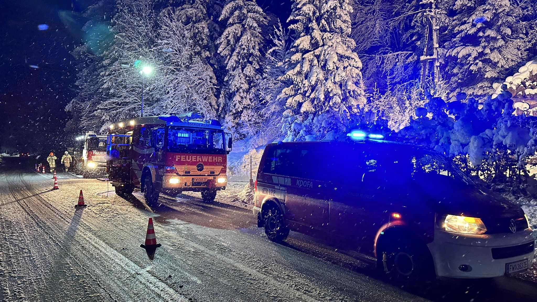 Wie vorhergesagt setzte seit gestern zum Teil stärkerer Schneefall ein. Am Samstagvormittag wurde die Feuerwehr Maria Alm über einen überhängenden Baum im Bereich der Ortseinfahrt informiert. Gemeinsam mit der Drehleiter aus Saalfelden wurde der Wipfel entfernt.