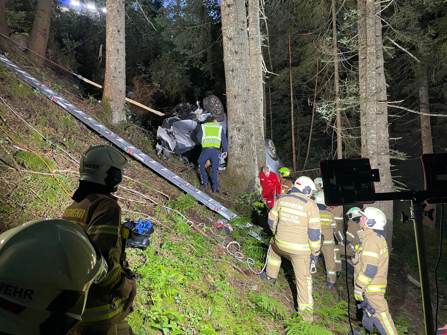 Nur zwei Stunden später wurde die Feuerwehr Maria Alm zu einem schweren Verkehrsunfall am Filzensattel alarmiert. Ein PKW war über eine Böschung abgestürzt, wobei eine Person das Fahrzeug nicht mehr selbstständig verlassen konnte. Von den Einsatzkräften wurde als Erstmaßnahme das Fahrzeug gesichert, sowie ein sicherer Zugang und eine Beleuchtung aufgebaut. Anschließend konnte die verletzte Person befreit und dem Roten Kreuz übergeben werden. Das Fahrzeug wurde mittels Seilwinde geborgen. Da nicht sicher war, ob noch weitere Personen beteiligt waren, wurde der umliegende Bereich zu Fuß, mit einer Drohne und einem Suchhund abgesucht.