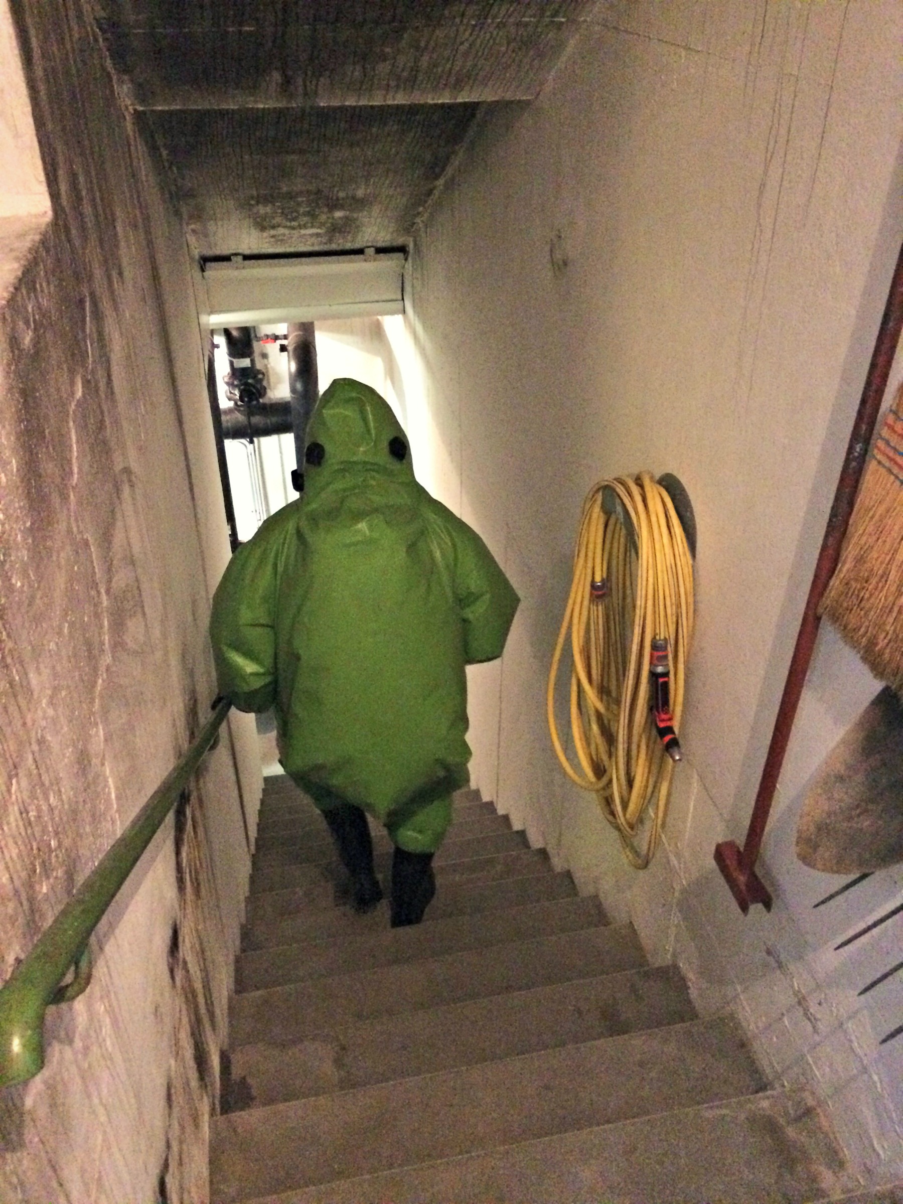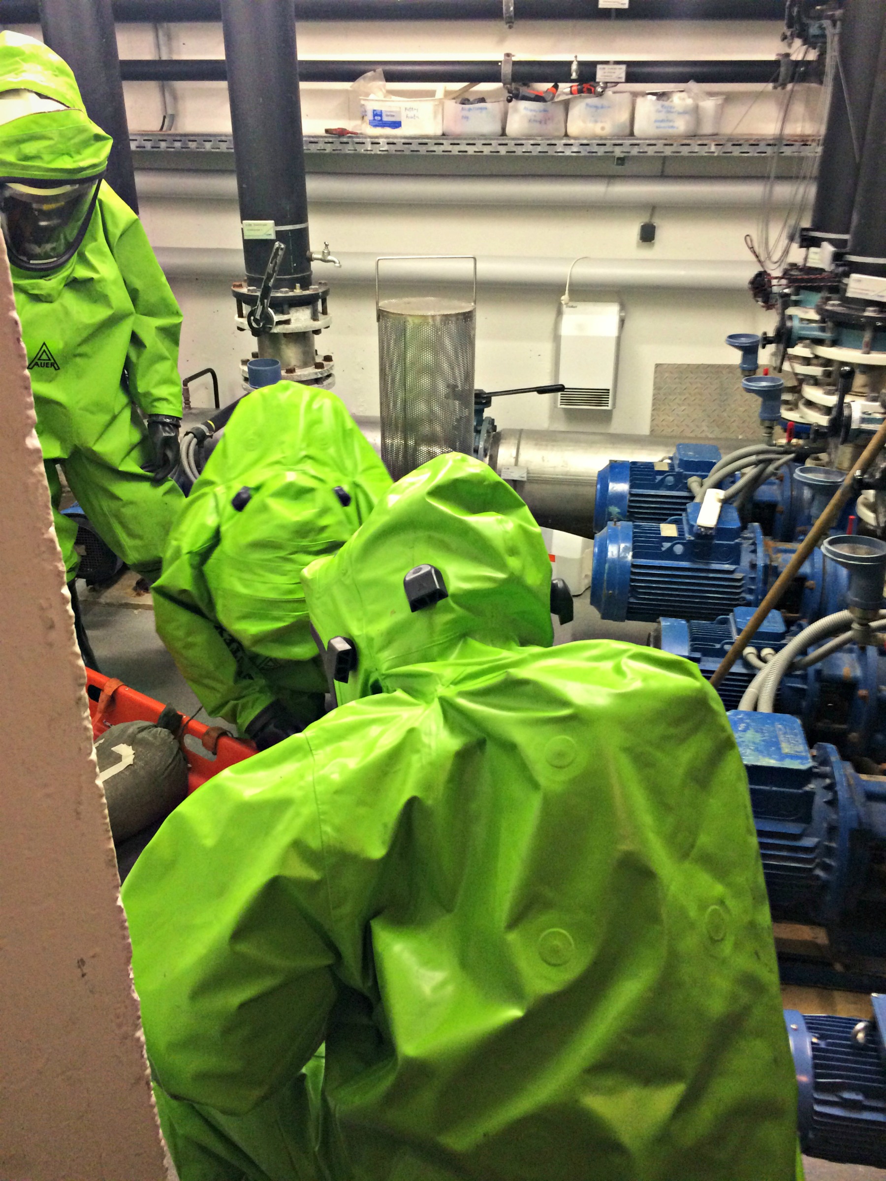 Nachdem alle Arbeiten beendet waren, wurde uns vom Bademeister durch die Technikräume des Schwimmbades gezeigt und wir konnten an einer Reserve-Chlorgasflasche das Aufschrauben einer Dichtkappe üben. Die Kameraden der Feuerwehr konnten somit ihr Wissen zum Thema Chlorgas wieder auffrischen und wertvolle Tipps sammeln.
